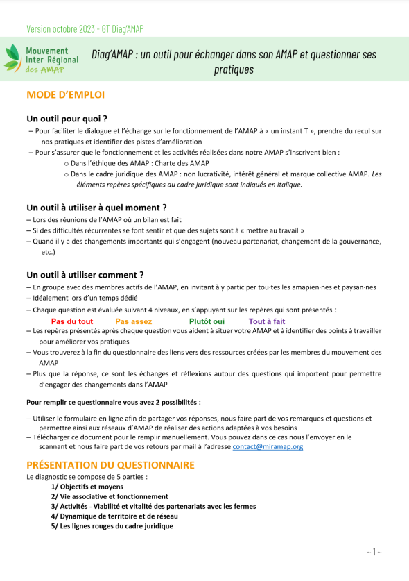Cet outil est pensé pour aider les amapien·nes à entamer un dialogue au sein de leur AMAP sur son fonctionnement à « un instant T » . Il permet de prendre du recul sur ce qui est pratiqué au sein de l’AMAP et identifier les pistes d’amélioration. Il permet également de s’assurer que l’AMAP s’inscrit bien dans la Charte des AMAP (cadre éthique) et dans le cadre juridique des AMAP comme dans l’utilisation de la marque collective « AMAP ».