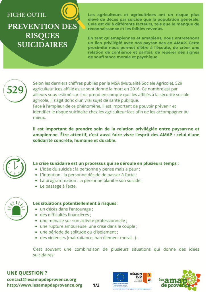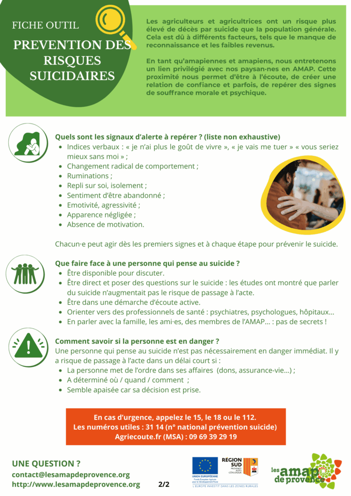 En tant qu’amapiennes et amapiens, nous entretenons un lien privilégié avec nos paysan·nes en AMAP. Cette proximité nous permet d’être à l’écoute, de créer une relation de confiance et parfois, de repérer des signes de souffrance morale et psychique.
