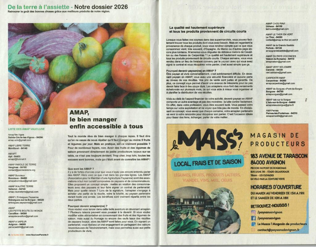 Notre newsletter mensuelle se fait le relais, auprès de tous les adhérents de Les AMAP de Provence, de nos actualités, éditoriaux, tribunes, pétitions, rendez-vous, bonnes pratiques et reportages vidéo ou photo.
